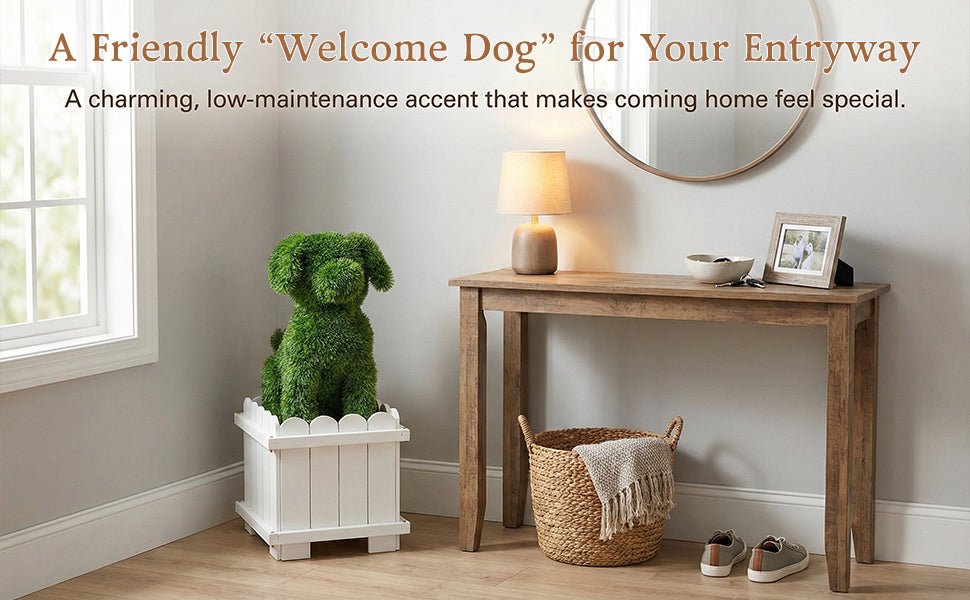 【Charming Dog Topiary for Instant Curb Appeal】 This artificial dog topiary sculpture instantly adds charm and personality to your front door, porch, patio, or garden. The realistic faux grass puppy design creates a welcoming focal point for home entrances and outdoor pathways, making your space stand out with designer-style elegance.
